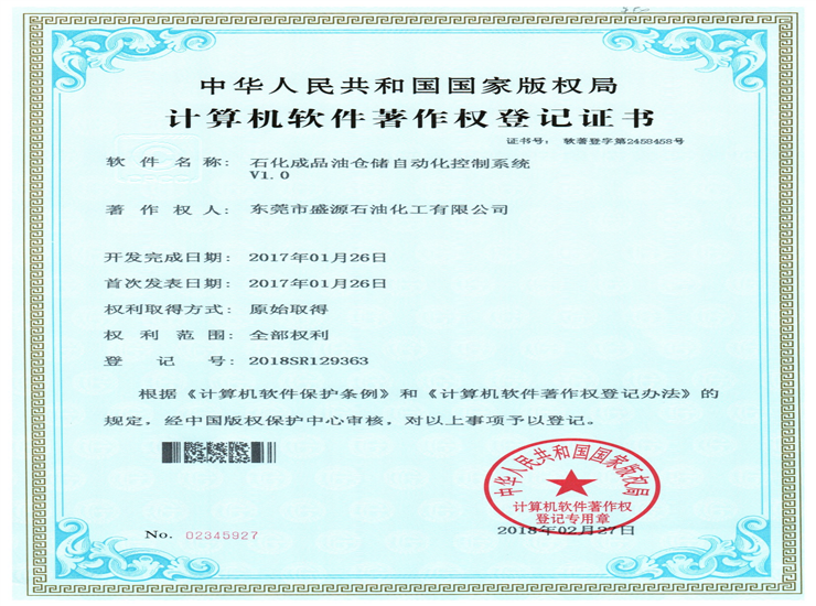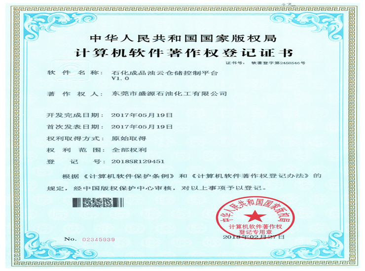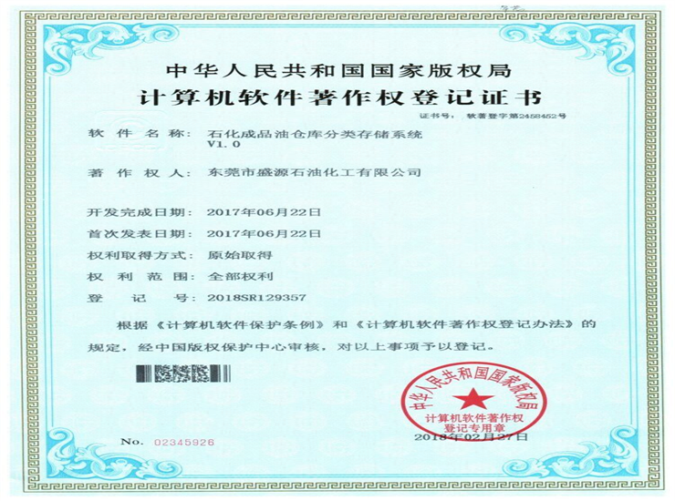 石化成品油分類存儲系統(tǒng)著作權(quán)登記證書Click for larger image