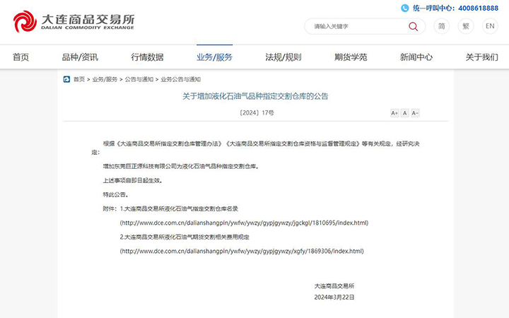 3月22月,大連商品交易所官網發(fā)布公告,增加東莞巨正源科技有限公司為液化石油氣品種指定交割倉庫,標準倉單最大量為90000噸,是該品種華南地區(qū)最大的基準庫,日發(fā)貨速度可達6000噸/天。