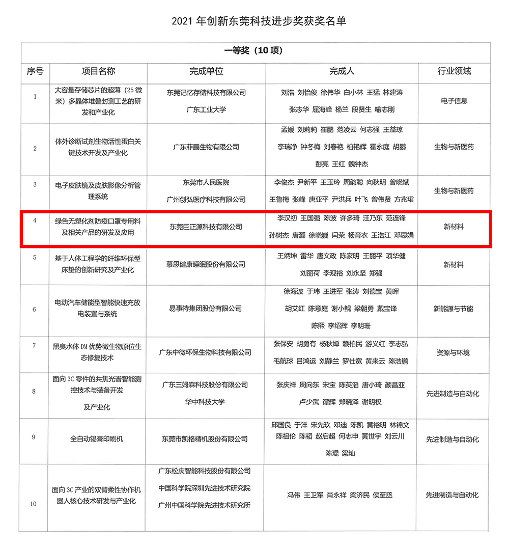 近日,2021年創新東莞科學技術獎獲獎項目名單發布。東莞巨正源科技有限公司研發的“綠色無塑化劑防疫口罩專用料及相關產品的研發及應用”項目榮獲東莞市科技進步獎一等獎。
