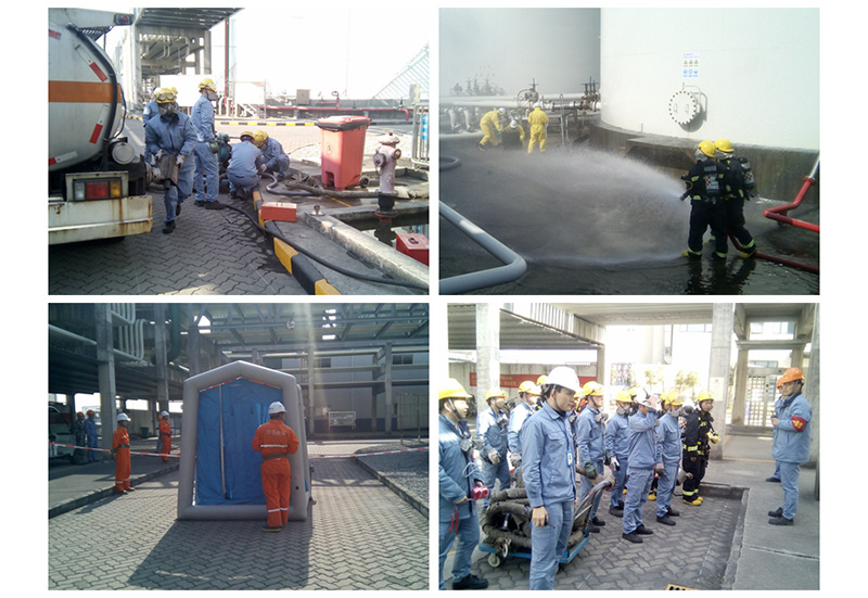1月23日,盛源公司聯(lián)合立沙島應(yīng)急基地在罐區(qū)舉行了T610罐金屬軟管破裂“盲演”(不預(yù)先通知時間、地點(diǎn),不設(shè)臺詞劇本)?,F(xiàn)場作業(yè)人員發(fā)現(xiàn)T610罐金屬軟管發(fā)生破裂泄漏后迅速報告,總指揮迅速啟動公司生產(chǎn)事故二級響應(yīng),現(xiàn)場指揮組織各應(yīng)急小組集合趕赴現(xiàn)場開展堵漏搶險工作。搶險救援組對泄漏點(diǎn)進(jìn)行堵漏,但并未堵漏成功,隨后聯(lián)系立沙島應(yīng)急基地請求外部支援。立沙島應(yīng)急基地人員到達(dá)現(xiàn)場后,與公司各應(yīng)急小組人員緊密配合,最終堵漏成功。