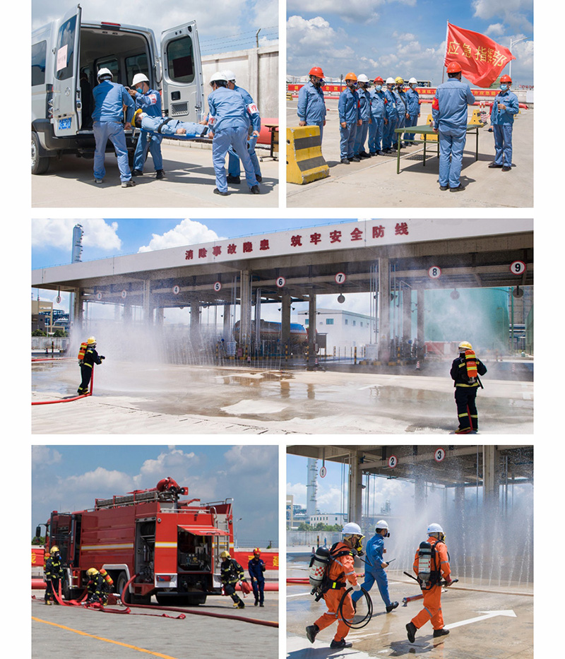 上午10:00,沙田鎮(zhèn)委副書記袁樹堅(jiān)宣布演練正式開始。此次演練現(xiàn)場(chǎng)模擬移動(dòng)式壓力容器在裝卸臺(tái)進(jìn)行丙烷充裝時(shí)發(fā)生大量泄漏,一名充裝員工凍傷,因泄漏量大無(wú)法靠近,其他員工立即將受傷員工轉(zhuǎn)移至安全區(qū)域,并先后啟動(dòng)裝置級(jí)、公司級(jí)事故應(yīng)急救援預(yù)案,公司領(lǐng)導(dǎo)接報(bào)后立即趕往事故現(xiàn)場(chǎng),成立現(xiàn)場(chǎng)指揮部,生產(chǎn)處置組、疏散組、警戒組、救援組、消防組、后勤組、工程搶險(xiǎn)組等按照各自的應(yīng)急處置職責(zé)迅速開展救援工作。